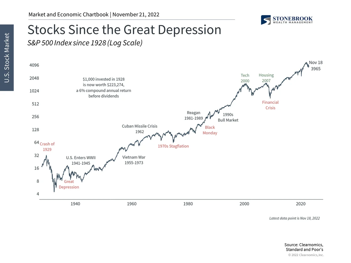 So, although the stock market tends to rise over long timeframes, there has never been a period during which investors were perfectly content. In fact, the reason that investors earn positive returns is exactly because they are willing to stay invested during periods of market grief, knowing that eventually there will be acceptance. Thus, it is not just a nice coincidence that investors who stay diversified through thick and thin tend to do well - it is a direct consequence of market psychology.