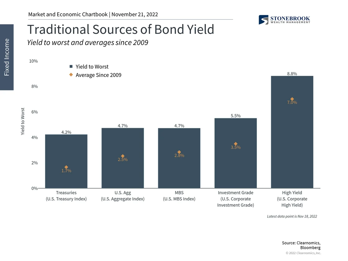 Third, investors can be thankful that it's easier to generate income from their portfolios than at any point since the global financial crisis. This is especially important for those in or near retirement. For years, investors were forced to "reach for yield" - i.e., to take more risk than they would otherwise like to in order to generate income via riskier bonds, dividend-paying stocks, or even more extreme measures such as crypto lending. So, while bond prices have struggled this year as interest rates have jumped, the silver lining is that yields are now higher across many types of bonds.