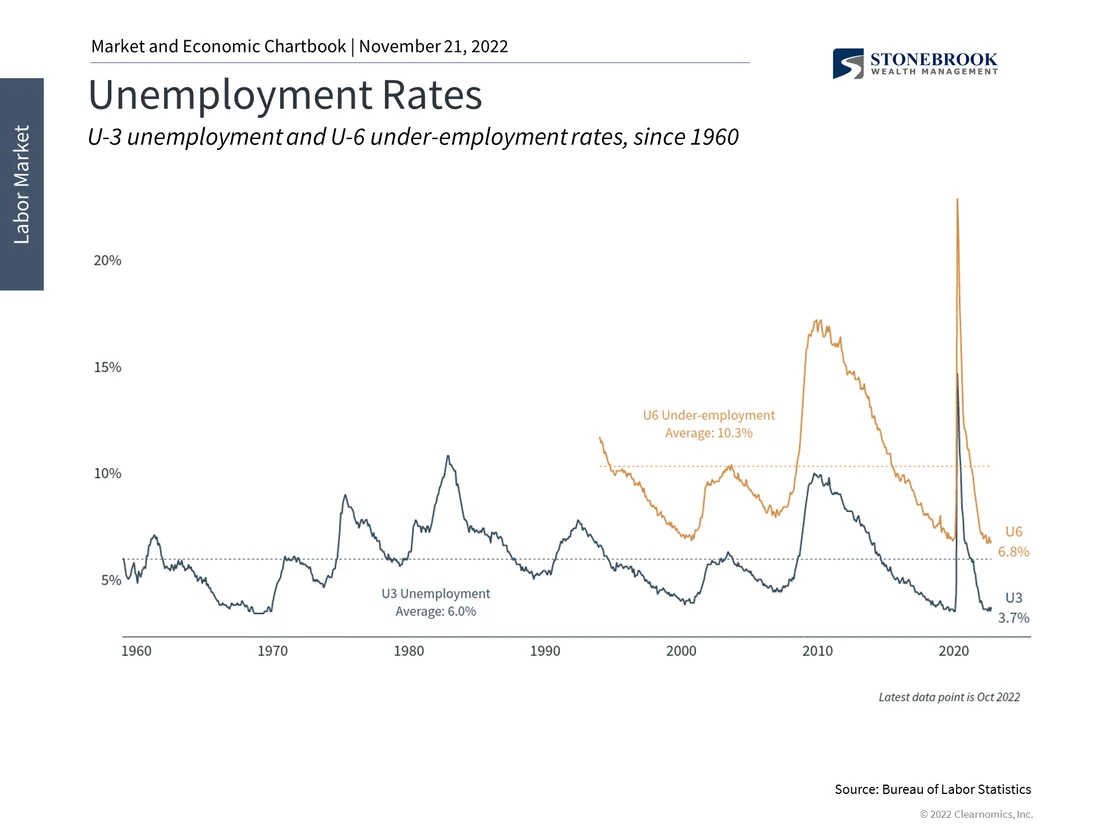 Second, investors and consumers can be thankful that, despite the economic doom-and-gloom, the job market is still strong - perhaps surprisingly so. The unemployment rate is only 3.7%, a sharp decline from the peak of 14.7% in 2020, and near the pre-pandemic low of 3.5%. Over the past year, the economy has added an average of 442,000 jobs per month, well above the pre-pandemic average of under 200,000 per month since the global financial crisis. There are still 10.7 million job openings compared to 6.1 million unemployed individuals, although some sectors such as tech are now experiencing layoffs. Wages are still rising at an average pace of 5.5% per year which, although slower than inflation, is still very welcome after a decade of stagnation.