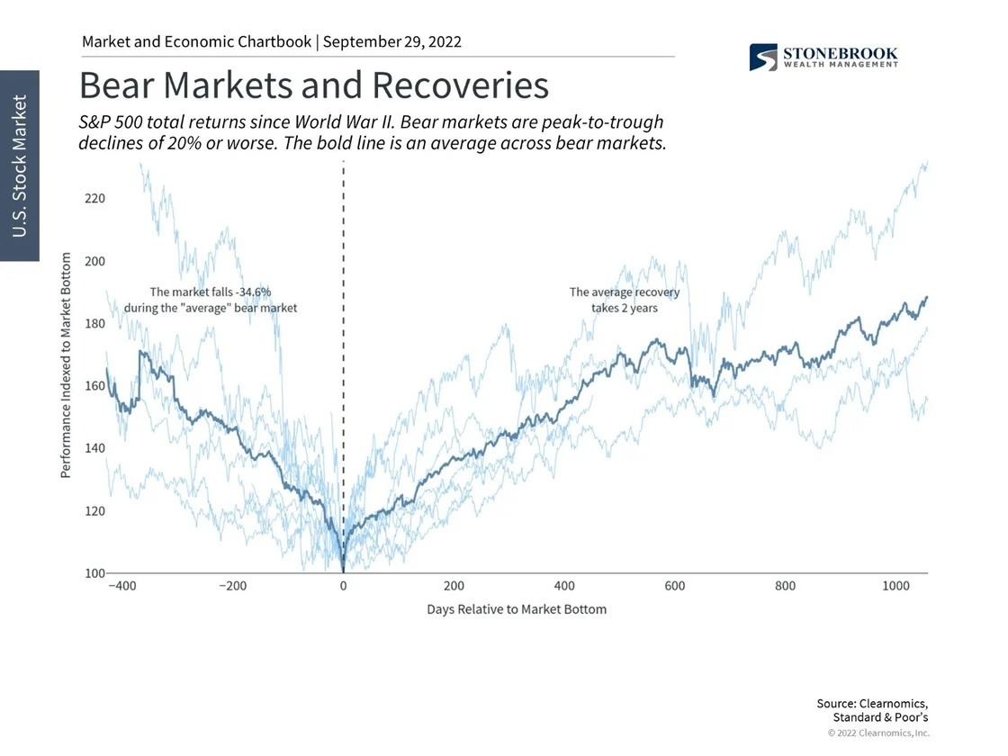 Of course, past performance is no guarantee of future results, and the point is not that bear markets are insignificant or inconsequential. Instead, it's a reminder to stay invested and diversified in order to benefit from all parts of the market cycle. The chart above highlights the fact that it can take two years for the market to fully recover from the typical bear market. However, the most important point is not when the market fully recovers, but when it begins to turn around. This rebound can happen suddenly even as most investors remain skeptical. Being patient and not focusing on each and every market headline can allow investors to avoid their own worst behavior.