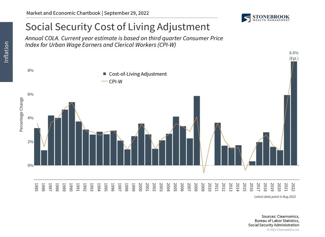 There are some silver linings in the short-term. First, the Social Security Cost-of-Living Adjustment (COLA) for 2022 will be the largest since the early 1980s. This calculation is based on the average third-quarter inflation rate for urban wage earners and clerical workers (known as CPI-W) each year, which means that it is on track to be above 8%. This is positive for those collecting social security, especially if energy prices and headline inflation continue to decline. This is also positive for those who will be eligible for benefits in the near-term, as your future benefit will reflect this adjustment.