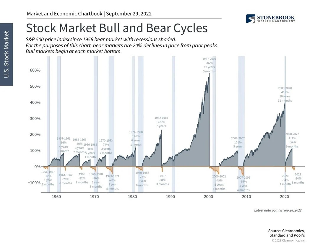 Eventually, all recessions and bear markets across history stabilized, paving the way for economic expansions and bull markets. These phases of the economic and market cycle are not created equal. The history of modern market and economic cycles suggests that while downturns may be sudden and deep, the subsequent expansions more than make up the difference. As the chart above shows, bear markets since World War II have lasted anywhere from 6 months to two-and-a-half years. During these periods, the U.S. stock market has fallen anywhere from 22% (1957) to 57% (the 2008 financial crisis) at their worst points.