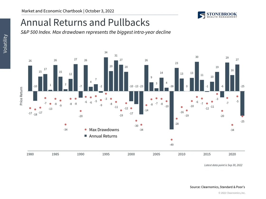 - This chart shows the performance of the stock market (bars) and the largest intra-year decline (dots) each year.